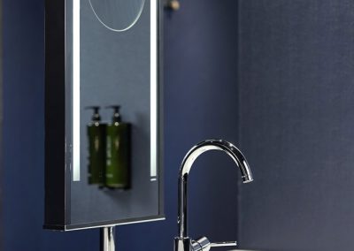I LED personalizzano la specchiera e le conferiscono un’aura di fascino fuori dal tempo. L’illuminazione verticale abbraccia l’intera superficie della specchiera e la riflette nella stanza in modo misurato e glamour, accompagnando ogni piccolo gesto e accogliendo il fruitore con garbo.